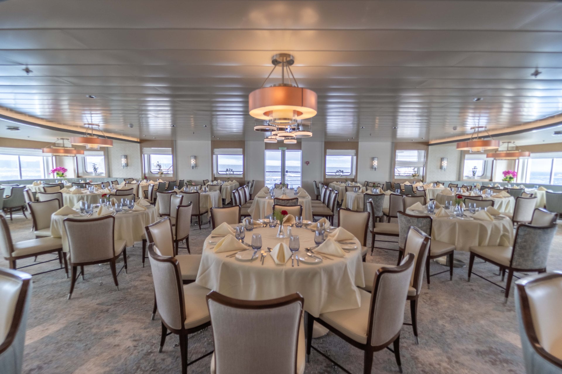 An Bord stehen zwei Restaurants zur Auswahl, das Hauptrestaurant mit einem Buffet am Morgen und Mittag, abends ergänzt durch À-la-carte-Gerichte in entspannter Atmosphäre und dem Tuscan Grill, das reservierungspflichtiges Spezialitätenrestaurant mit fokussiertem Menü und persönlicherem Rahmen. Tee, Kaffee und kleine Snacks sind rund um die Uhr verfügbar. Zum Abendessen sind Hauswein, Bier und Softdrinks inkludiert.