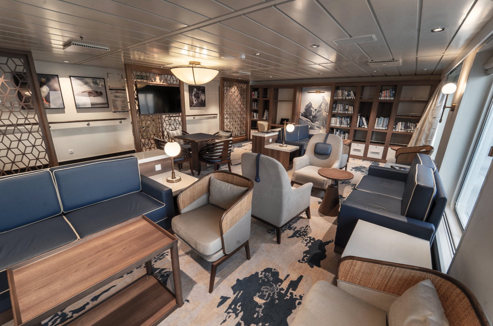 Die Bibliothek mit bodentiefen Fenstern ist ein ruhiger Rückzugsort. Hier finden sich Sachbücher zu Natur und Expeditionen, Bestimmungsführer, Reiseberichte, Romane sowie ausgewählte Spiele. In der Observation Lounge auf Deck 7 stehen zusätzlich Ferngläser und Wildlife-Guides bereit